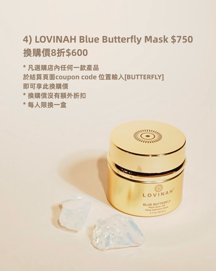- 請確保購物車有最少一件產品後,直接於購物車輸入優惠碼 「BUTTERFLY」 便可。請勿事前將產品加入購物車,否則你將會被收取正價。如客人輸入優惠碼後沒有立即付款下單,於下次再登入時,優惠碼有可能會自動被刪除,請務必再次輸入優惠碼,並於確認Cart Total- Coupon- 已顯示扣減「-$150」才付款下單。任何原因因為沒有輸入優惠碼而多收取的金額均不會退回。
