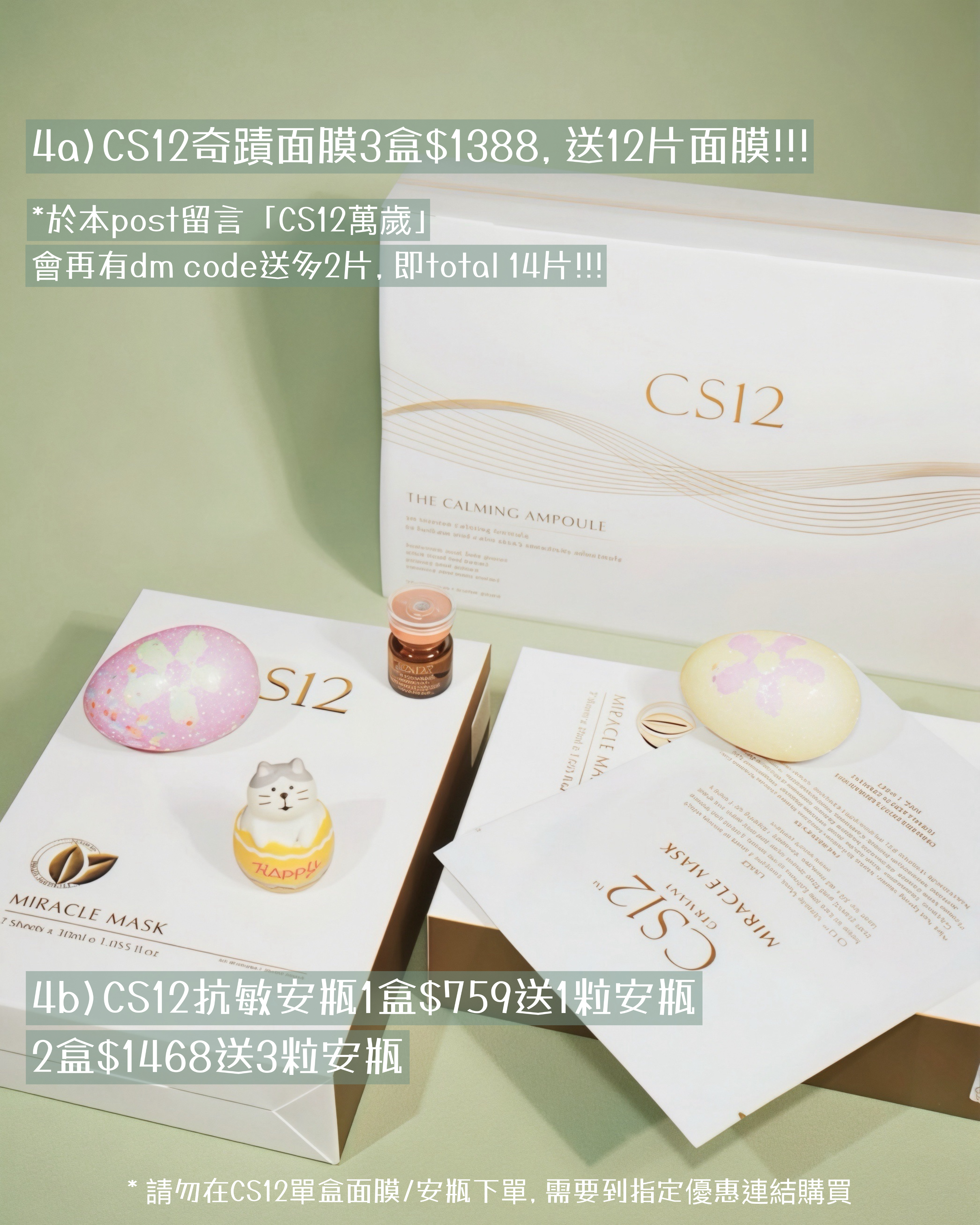 - [CS12x4月優惠] Miracle Mask 奇蹟面膜 三盒$1388 ✶✶即額外送12片面膜!!!多買多送✶ ✶立即到FB/IG指定帖文留言獲取優惠碼,輸入優惠碼每買一set加碼再送2片面膜,多買多送✶✶